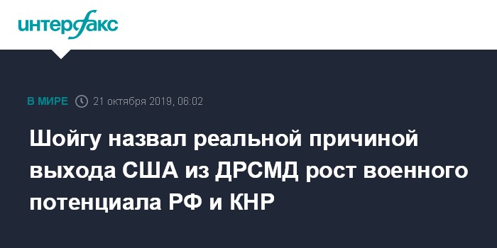 Москва. 21 октября. INTERFAX.RU - Восстановление оборонного потенциала России, растущая мощь Китая и расширение военно-технического сотрудничества между этими двумя странами стали причиной одностороннего выхода Вашингтона из Договора о ликвидации ракет средней и меньшей дальности (ДРСМД), заявил министр обороны РФ Сергей Шойгу.