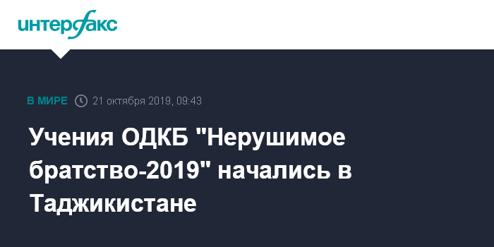 Москва. 21 октября. INTERFAX.RU - Учения ОДКБ "Нерушимое братство-2019" с участием военнослужащих шести стран (Россия, Белоруссия, Армения, Таджикистан, Казахстан и Киргизия) начались в понедельник на таджикском полигоне "Харб-Майдон", расположенном вблизи с афганской границей.