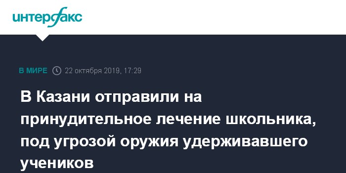 Москва. 22 октября. INTERFAX.RU - Ново-Савиновский районный суд Казани во вторник отправил на принудительное психиатрическое лечение школьника из Казани, который в мае этого года с ножом и пистолетом удерживал одноклассников. Об этом сообщил агентству "Интерфакс" официальный представитель прокуратуры Татарстана Руслан Галиев.