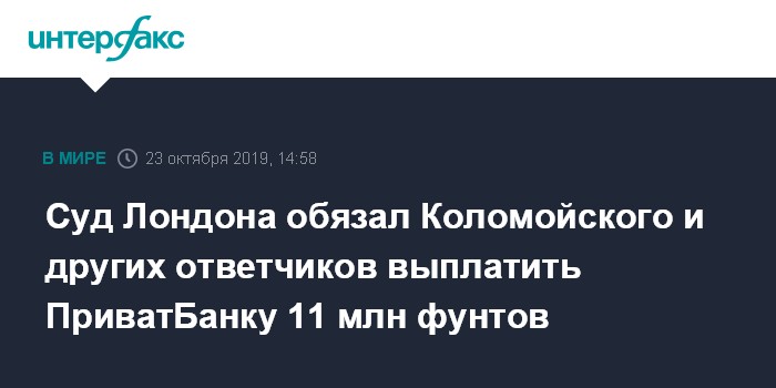 Москва. 23 октября. INTERFAX.RU - Апелляционный суд Лондона обязал бывших владельцев ПриватБанка (Киев) до 12 ноября оплатить расходы банка на 10,9 млн фунтов стерлингов, сообщила пресс-служба банка.