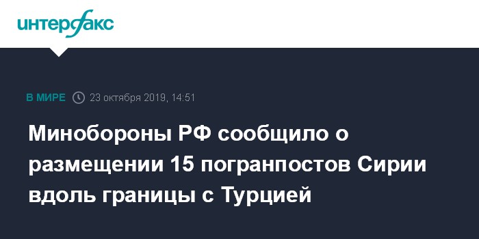 Москва. 23 октября. INTERFAX.RU - Сирия выставит 15 пограничных постов вдоль границы с Турцией, следует из карты, опубликованной Минобороны РФ в среду.