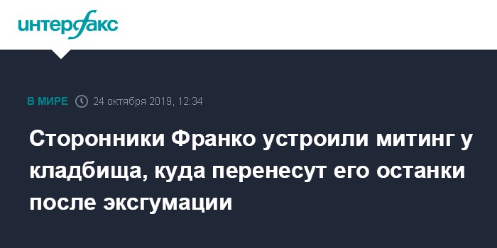Москва. 24 октября. INTERFAX.RU - Сотни человек с флагами франкистской Испании собрались у кладбища Мингоррубио, куда позже в четверг будут перемещены останки бывшего руководителя страны Франсиско Франко.