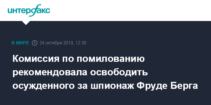 Москва. 24 октября. INTERFAX.RU - Московская комиссия по помилованию рекомендовала президенту помиловать осужденного за шпионаж гражданина Норвегии Фруде Берга. Об этом сообщила член комиссии, уполномоченный по правам человека в Москве Татьяна Потяева.
