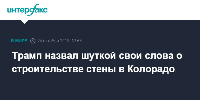 Москва. 24 октября. INTERFAX.RU - Президент США Дональд Трамп объявил о строительстве защитной стены в штате Колорадо, но затем уточнил, что это была шутка, сообщают в четверг западные СМИ.