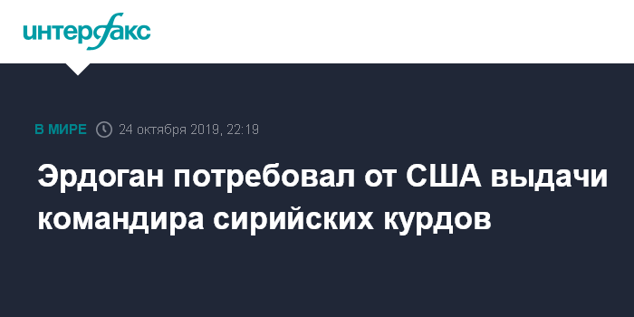 Москва. 24 октября. INTERFAX.RU - Президент Турции Реджеп Тайип Эрдоган в четверг заявил, что США должны выдать Анкаре командующего курдско-арабским альянсом "Сирийские демократические силы" (СДС) Мазлума Кобани Абди.