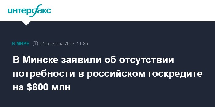 19 октября первый вице-премьер - министр финансов РФ Антон Силуанов заявил, что государственного кредита на $600 млн, который уже длительное время обсуждают Россия и Белоруссия, может в итоге не быть. Он отметил, что перспективы предоставления кредита никак не связаны с планами интеграции экономик двух стран.