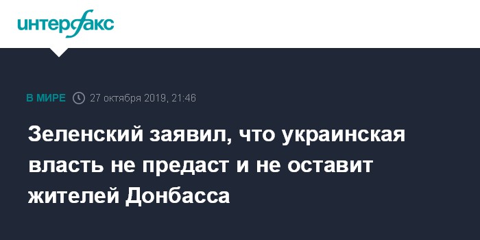 Москва. 27 октября. INTERFAX.RU - Президент Украины Владимир Зеленский заявил, что власть сделает все, чтобы не предать и не оставить жителей Донбасса при решении вопроса о разведении сил на линии соприкосновения.
