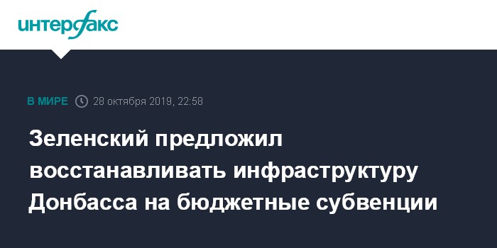 Москва. 28 октября. INTERFAX.RU - На заседании фракции "Слуга народа" президент Украины Владимир Зеленский предложил перенаправить часть нераспределенных бюджетных субвенций на восстановление социально-экономического и инфраструктурного потенциала Донбасса, заявил замглавы фракции Александр Корниенко.