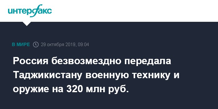 Москва. 29 октября. INTERFAX.RU - Российские военнослужащие безвозмездно передали Вооруженным силам Таджикистана партию военной техники и вооружения, общая стоимость которой составляет около 320 млн рублей, сообщает во вторник пресс-служба Центрального военного округа (ЦВО) РФ.
