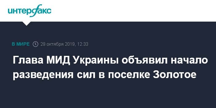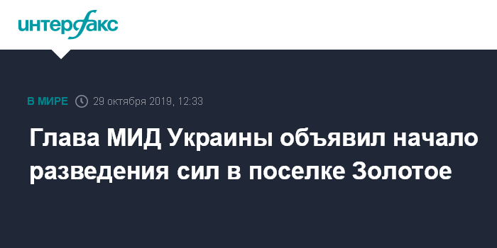 Москва. 29 октября. INTERFAX.RU - Министр иностранных дел Украины Вадим Пристайко заявил во вторник о начале разведения сил противоборствующих сторон в поселке Золотое (Луганская область).