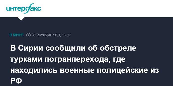 Москва. 29 октября. INTERFAX.RU - Турецкие военные подвергли минометному обстрелу погранпереход на севере Сирии, когда там находились российские военные полицейские, передает во вторник сирийское государственное агентство SANA.