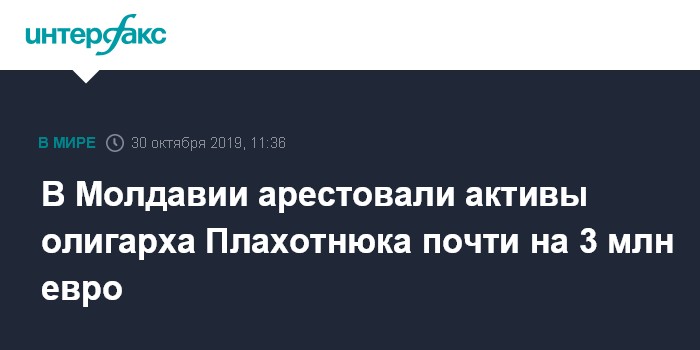 Москва. 30 октября. INTERFAX.RU - Прокуратура Молдавии по борьбе с коррупцией наложила арест на активы олигарха Владимира Плахотнюка на общую сумму почти 3 млн евро, сообщила во вторник пресс-служба прокуратуры.