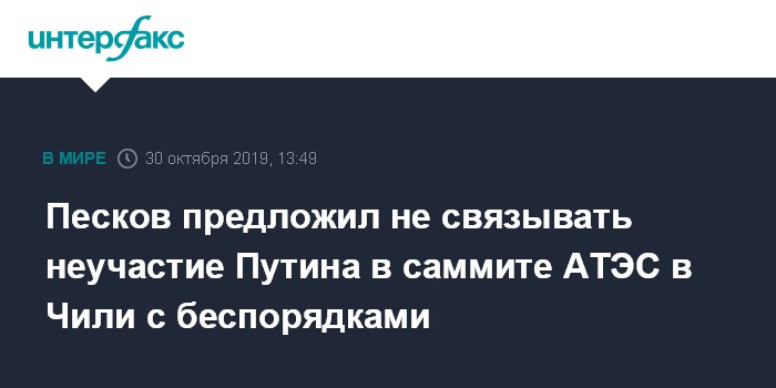 Москва. 30 октября. INTERFAX.RU - Президент Владимир Путин не поедет на саммит АТЭС в Чили 13-14 ноября, но это не связано с беспорядками в Сантьяго, заявил пресс-секретарь главы государства Дмитрий Песков.