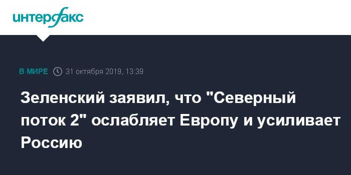 Москва. 31 октября. INTERFAX.RU - Ввод в эксплуатацию "Северного потока 2", чему будет способствовать решение властей Дании разрешить строительство этого газопровода, усиливает Россию и ослабляет Европу, заявляет президент Украины Владимир Зеленский.