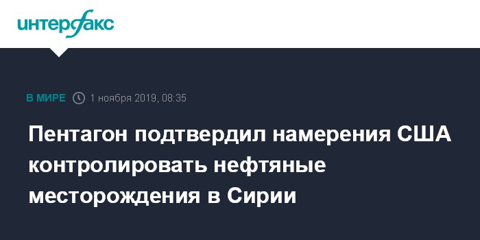 Москва. 1 ноября. INTERFAX.RU - Министр обороны США Марк Эспер заявил, что контроль американских военных над районами нефтяных месторождений в Сирии необходим как для защиты их от "Исламского государства" (ИГ или ИГИЛ, запрещенная в РФ террористическая группировка), так и для обеспечения доступа к ним военного альянса Демократические силы Сирии, оппозиционного официальному Дамаску.