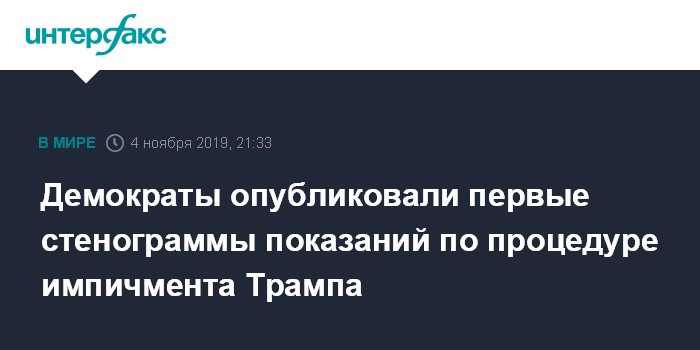 Москва. 4 ноября. INTERFAX.RU - Демократы палаты представителей США опубликовали в понедельник первые стенограммы показаний, данных в рамках процедуры импичмента президента США Дональда Трампа, сообщает комитет по разведке палаты представителей США.