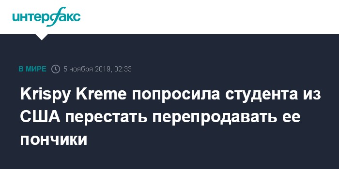 Москва. 5 ноября. INTERFAX.RU - Американская компания Krispy Kreme потребовала от студента из Миннесоты прекратить перепродавать ее пончики, которые он покупал в Айове и вез в родной город, где нет магазинов этой компании, сообщает Business Insider.
