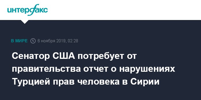 "Именно поэтому я сегодня представляю срочную резолюцию с просьбой к госсекретарю проинформировать Сенат в течение 30 дней о масштабах нарушений Турцией прав человека в Сирии", - добавил сенатор.