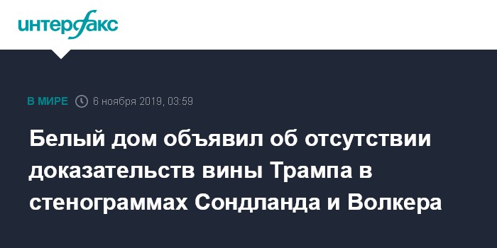 Москва. 6 ноября. INTERFAX.RU - Белый дом после обнародования стенограмм допроса в Конгрессе постпреда США в ЕС Гордона Сондланда и экс-спецпредставителя США на Украине Курта Волкера в рамках процедуры импичмента президента США настаивает на невиновности Дональда Трампа.