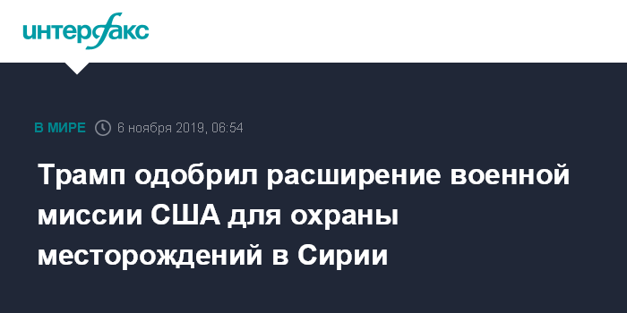 Москва. 6 ноября. INTERFAX.RU - Президент США Дональд Трамп одобрил расширенную военную миссию по обеспечению безопасности нефтяных месторождений на востоке Сирии, сообщает Associated Press со ссылкой на источники.