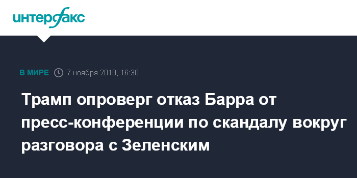 Москва. 7 ноября. INTERFAX.RU - Президент США Дональд Трамп опроверг сообщение Washington Post о том, что генеральный прокурор Уильям Барр якобы отклонил запрос Трампа провести пресс-конференцию, посвященную скандалу вокруг разговора с президентом Украины Владимиром Зеленским.