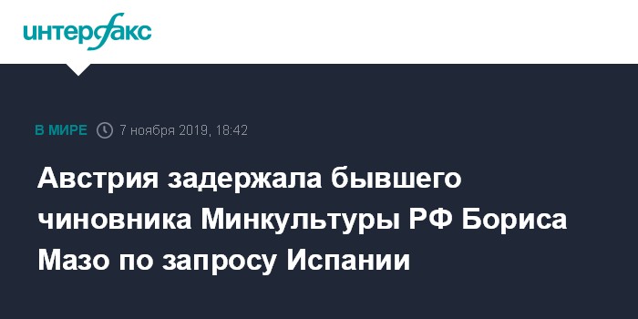 Москва. 7 ноября. INTERFAX.RU - Экс-директор департамента министерства культуры РФ Борис Мазо задержан правоохранительными органами Австрии по испанскому запросу, сообщила в четверг "Интерфаксу" представитель австрийской прокуратуры Нина Буссек.