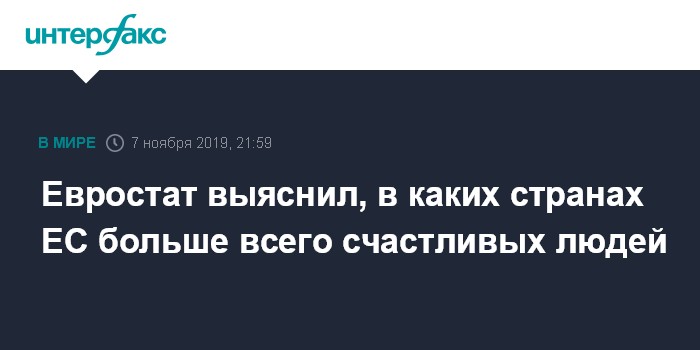 Москва. 7 ноября. INTERFAX.RU - Наибольшее число счастливых людей в ЕС проживают в Бельгии, Нидерландах, Австрии и Финляндии, говорится в опросе, опубликованном в четверг Евростатом. Опросы проводились в 2018 году, но их точные сроки проведения и число участников в исследовании не указаны.