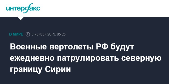 Накануне вечером руководитель российского центра по примирению враждующих сторон в Сирии генерал-майор Юрий Боренков сообщил, что 7 ноября российская армейская авиация осуществила первое патрулирование на северо-востоке Сирии. Вертолеты пролетели по маршруту: аэродром "Квайрес" - Айн-Иса - Ракка - вдоль водохранилища Асада - аэродром "Квайрес". В свою очередь российская военная полиция провела патрулирование по маршруту Айн-Иса - Алау - Телль-Эм - Самен - Хазима.