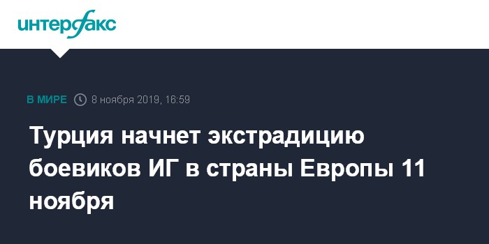 Москва. 8 ноября. INTERFAX.RU - Турция начнет экстрадицию задержанных террористов "Исламского государства" (ИГ, запрещенная в России организация) в страны их происхождения 11 ноября, сообщило в пятницу агентство "Анадолу" со ссылкой на главу МВД Турции Сулеймана Сойлу.