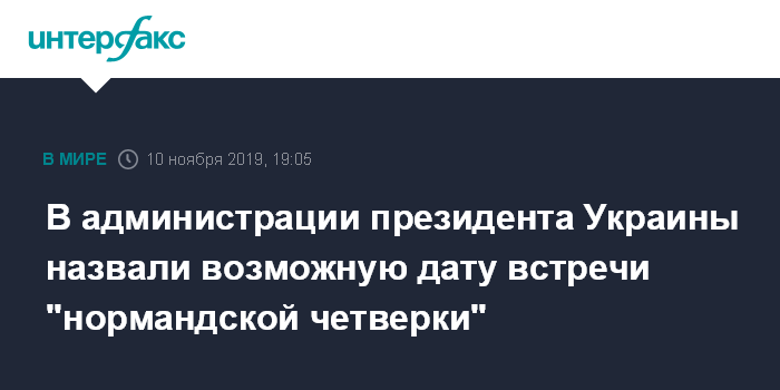 Москва. 10 ноября. INTERFAX.RU - Встреча лидеров стран "нормандского формата" (Украина, Германия, Франция, РФ) может состояться 24 или 26 ноября, сообщает издание "Зеркало недели. Украина" со ссылкой на источник в офисе украинского президента.