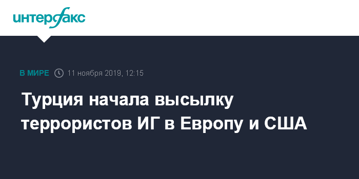 О том, что Турция начнет 11 ноября экстрадицию задержанных террористов "Исламского государства" (ИГ, террористическая организация, запрещена в России) в страны их происхождения, сообщило в минувшую пятницу, 8 ноября, агентство "Анадолу" со ссылкой на главу МВД Турции Сулеймана Сойлу.