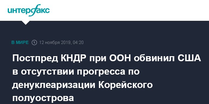 Москва. 12 ноября. INTERFAX.RU - Причиной отсутствия прогресса в вопросе денуклеаризации Корейского полуострова является провокационная деятельность Соединенных Штатов, заявил постпред КНДР при ООН Ким Сон.