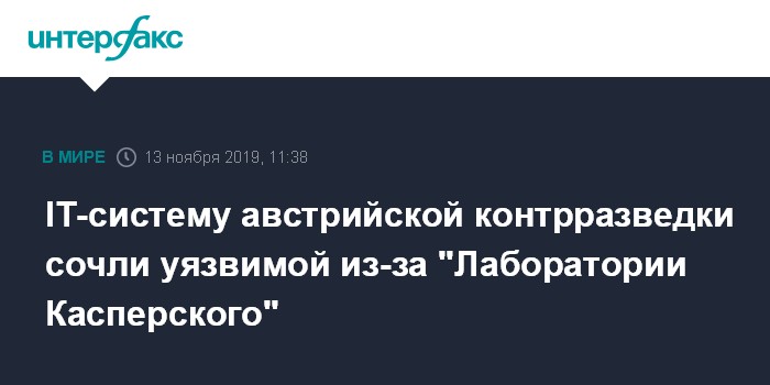 Представители этих спецслужб пришли к выводу, что использование на компьютерах антивирусных программ "Лаборатории Касперского" связано с "чрезвычайно высокой угрозой шпионажа" в отношении австрийской службы госбезопасности, сообщила в среду радиостанция Deutsche Welle со ссылкой на базирующуюся в Вене газету Osterreich.