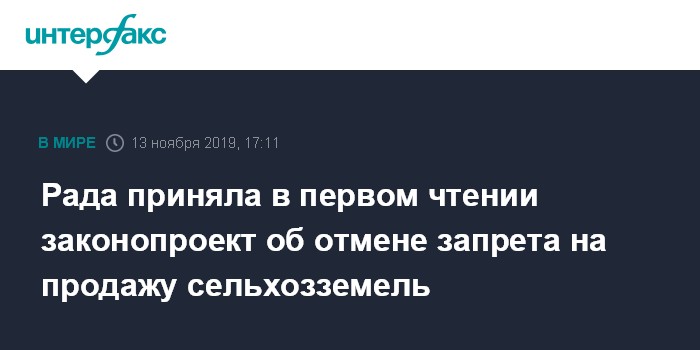 Москва. 13 ноября. INTERFAX.RU - Верховная Рада приняла в первом чтении законопроект "Об обороте земель сельскохозяйственного назначения", который предусматривает отмену с 1 октября 2020 года запрета на отчуждение сельхозземель всех форм собственности.