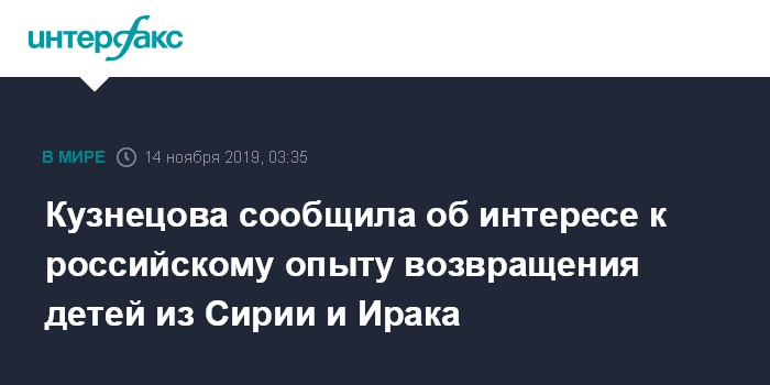 Москва. 14 ноября. INTERFAX.RU - Россия разработала эффективный алгоритм работы по возвращению на родину российских детей с территории Сирии и Ирака, этим опытом уже заинтересовались в других государствах, сообщила в интервью "Российской газете" уполномоченный при президенте РФ по правам ребенка Анна Кузнецова.