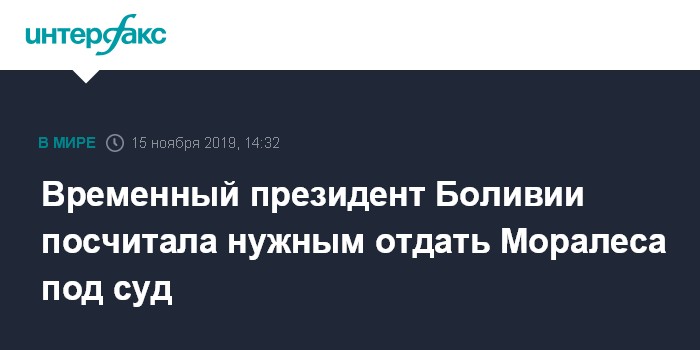 Москва. 15 ноября. INTERFAX.RU - Бывшего президента Боливии Эво Моралеса следует привлечь к суду, если он вернется в страну, заявила телеканалу BBC временный президент Жанин Аньес.