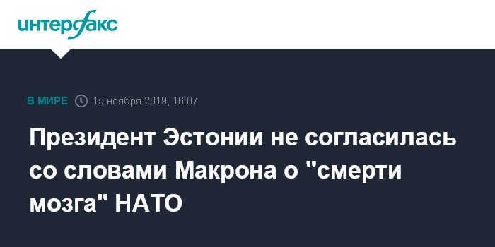 Москва. 15 ноября. INTERFAX.RU - Президент Эстонии Керсти Кальюлайд в пятницу заявила, что не разделяет мнение французского лидера Эммануэля Макрона о "смерти мозга" НАТО.