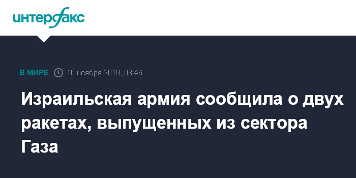 Москва. 16 ноября. INTERFAX.RU - Две ракеты были выпущены из сектора Газа по территории Израиля, обе перехватила система ПВО, сообщает пресс-служба армии обороны страны в твиттере.
