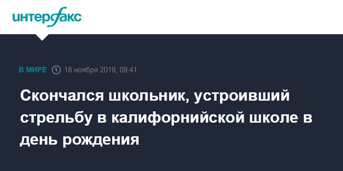 Москва. 16 ноября. INTERFAX.RU - Подросток, устроивший стрельбу в школе американского города Санта-Кларита (Калифорния), скончался в больнице, сообщает телеканал CBS News.