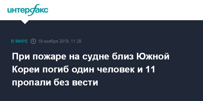 Москва. 19 ноября. INTERFAX.RU - Жертвой пожара на рыбацкой шхуне у берегов Южной Кореи стал один человек, еще 11 рыбаков числятся пропавшими без вести, сообщает информационное агентство Associated Press.