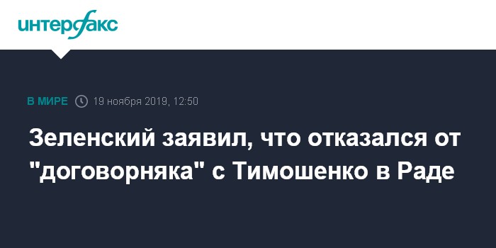 Москва. 19 ноября. INTERFAX.RU - Президент Украины Владимир Зеленский подтвердил, что лидер "Батьковщины" Юлия Тимошенко предлагала свои кандидатуры для назначения на государственные должности в обмен на поддержку партии "Слуга народа" в Верховной раде, однако получила отказ из-за недопустимости практики "закулисных договоренностей".