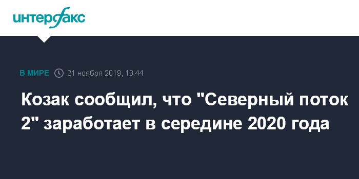 Москва. 21 ноября. INTERFAX.RU - "Северный поток 2" заработает в середине 2020 года, сообщил журналистам вице-премьер РФ Дмитрий Козак.