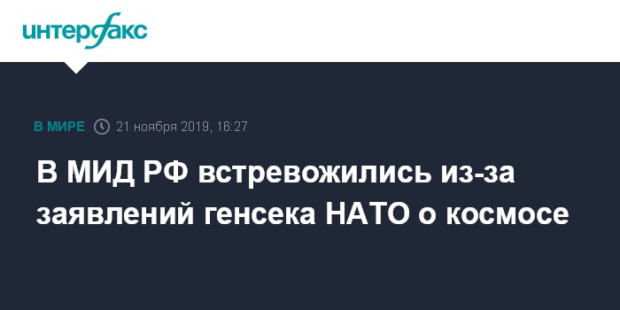 Москва. 21 ноября. INTERFAX.RU - В Москве сказали, что заявление генерального секретаря НАТО Йенса Столтенберга о том, что космос станет сферой новой оперативной деятельности альянса, вызывает тревогу.