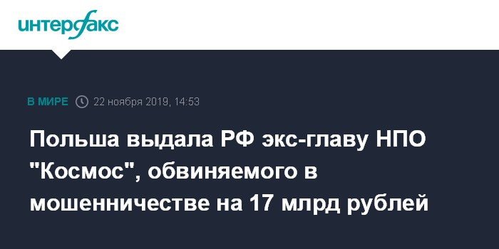 Польша выдала РФ экс-главу НПО "Космос", обвиняемого в мошенничестве на 17 млрд рублей