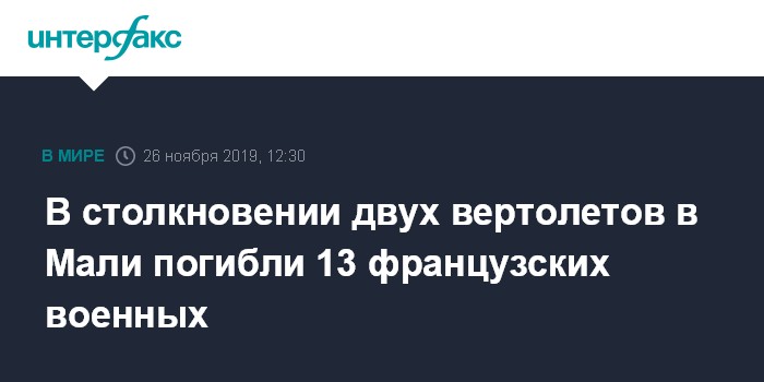 Москва. 26 ноября. INTERFAX.RU - В результате столкновения двух вертолетов в ходе боевых операций в Мали погибли 13 французских военнослужащих, сообщили в Елисейском дворце.