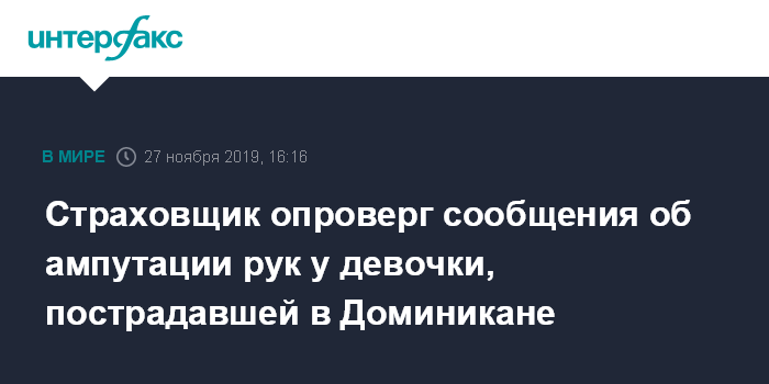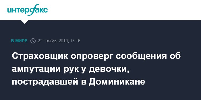 Москва. 27 ноября. INTERFAX.RU - Страховая компания ERV опровергла информацию об ампутации рук у 12-летней девочки, пострадавшей в ДТП с туристическим автобусов в Доминикане.