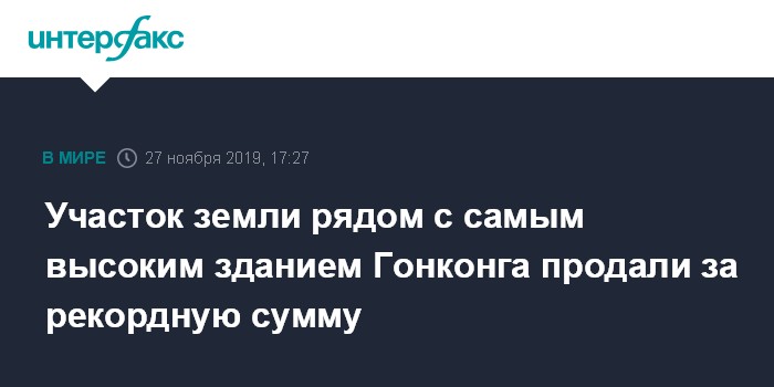 Москва. 27 ноября. INTERFAX.RU - Власти Гонконга продали участок земли, располагающийся по соседству с самым высоким зданием специального района КНР, за рекордные 42 млрд гонконгских долларов ($5 млрд) на правительственном аукционе.