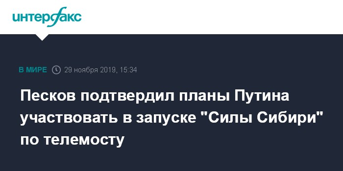 Москва. 29 ноября. INTERFAX.RU - Пресс-секретарь президента РФ Владимира Путина Дмитрий Песков подтвердил, что глава государства намерен принять участие в церемонии запуска газопровода "Сила Сибири".