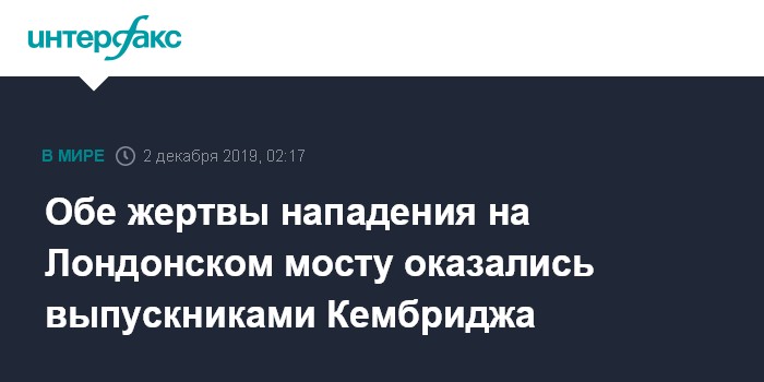 Москва. 2 декабря. INTERFAX.RU - Двое погибших в результате нападения мужчины с ножом в центре Лондона 29 ноября были выпускниками Кембриджского университета (Англия), сообщает "Би-би-си" со ссылкой на лондонскую полицию.