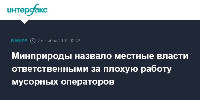 Москва. 2 декабря. INTERFAX.RU - Министр природных ресурсов и экологии РФ Дмитрий Кобылкин возлагает ответственность за некачественную работу операторов системы управления отходами на местах на региональные власти.